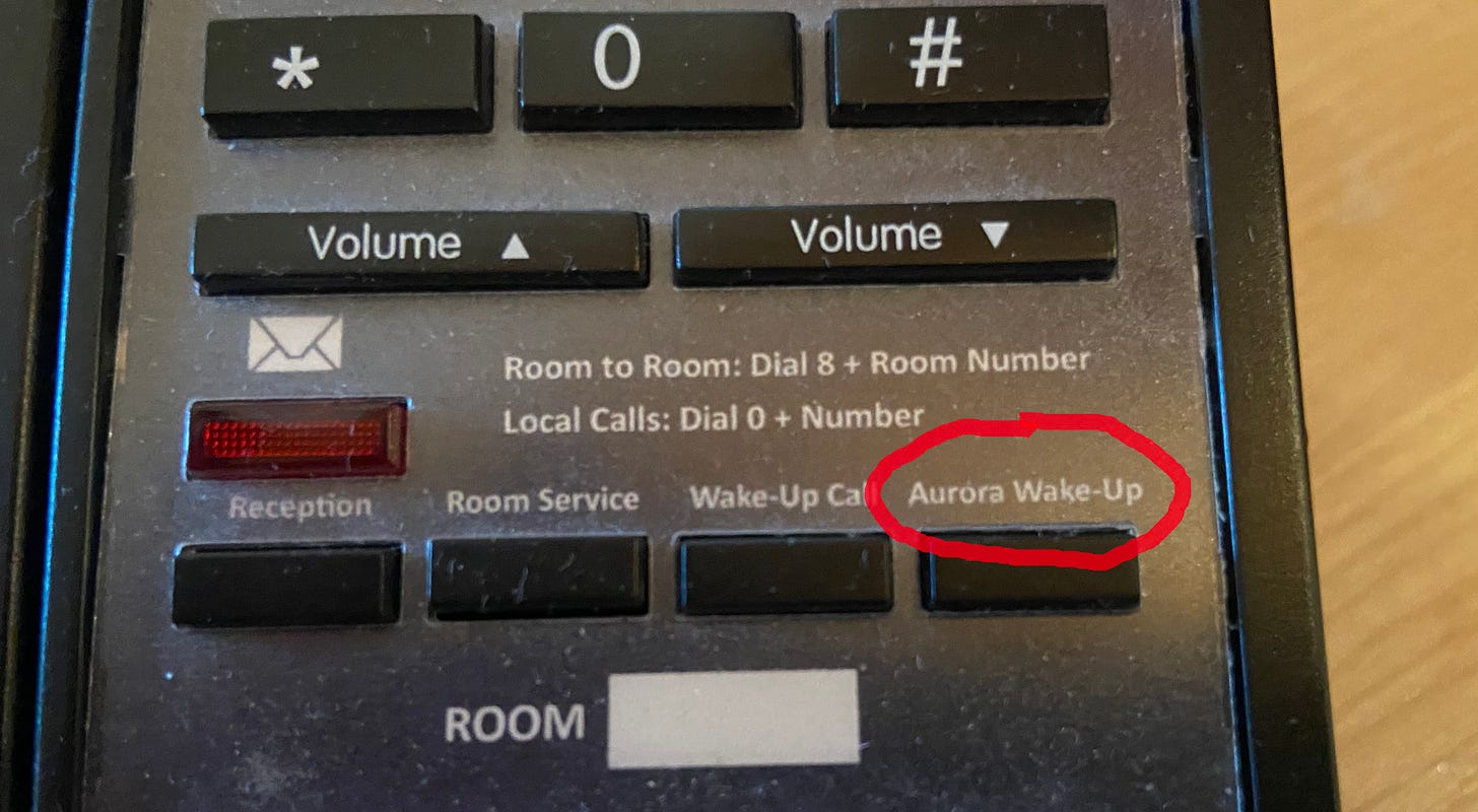 The chances of seeing the lights are also boosted by staying at a hotel which knows the value and importance of guests making the most of their opportunity. We stayed at the Hotel Rangá (pronounced Rangow, rhymes with cow) near Hella on Iceland’s south coast. On arriving we were told that there was an alert service available should the Aurora show up, linked to the telephone in our room. I was amazed to find not just that such a service existed, but it was hard-printed as a button on the phone!